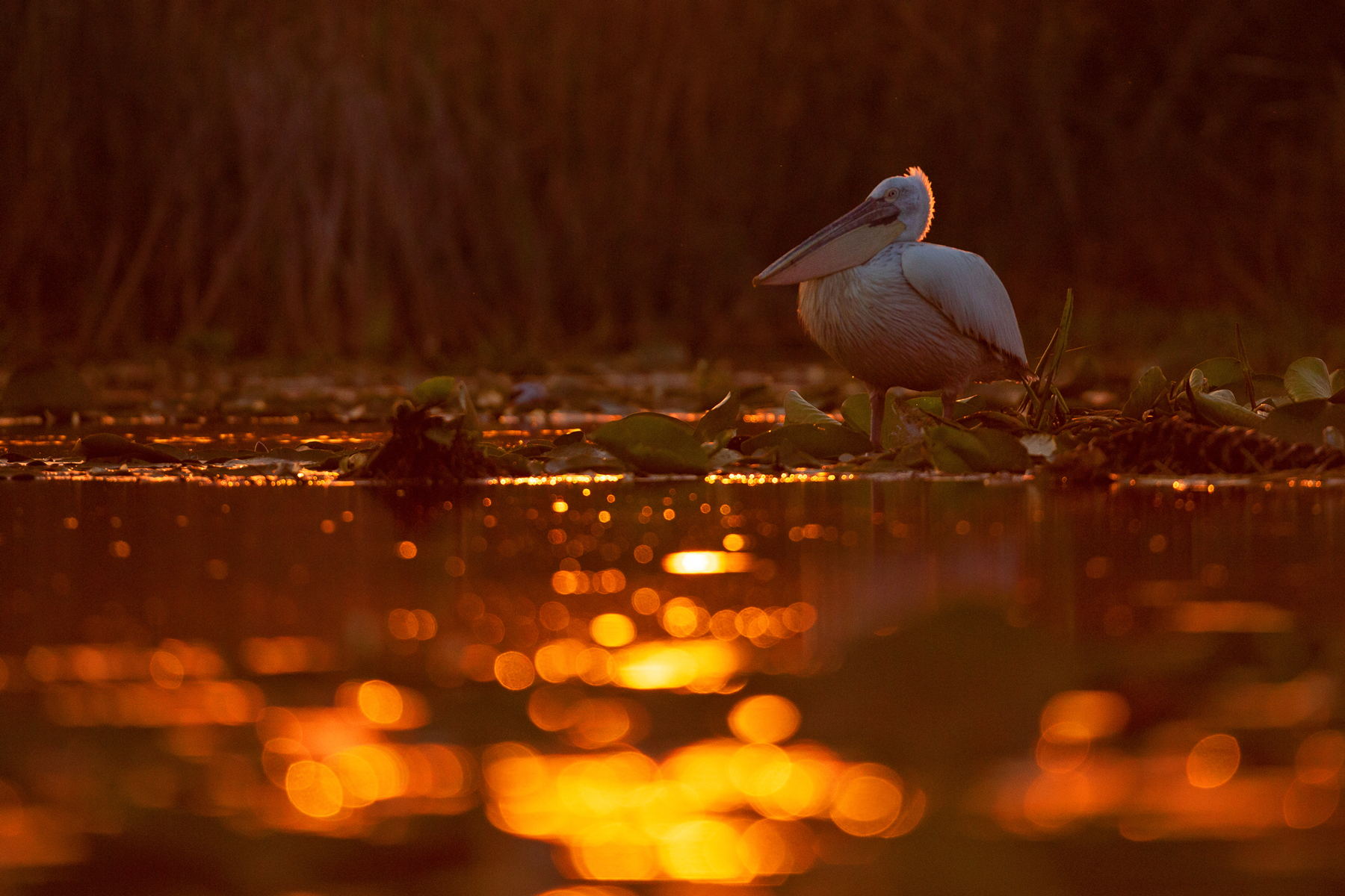 Dalmatian Pelican burning in a fiery sunset in the Danube Delta (Image by Mike Watson)