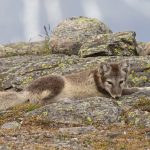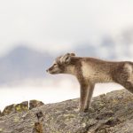 A young Arctic Fox has a stretch after a long nap at Ossian Sarsfjellet (Image by Mike Watson)