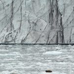 A Bearded Seal is dwarfed by the immense Dahlbreen calving face in west Spitsbergen (Image by Mike Watson)