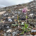 We crossed Kongfjorden in the early morning to Peirsonhamna, Blömstrandhalvøya (‘Flower Beach Half-island/peninsula’) next to London, which was an adopted name used as a joke by the Norwegians. It came into general use on Blömstrandhalvøya, the site of a failed marble mining attempt by Ernest Mansfield, quickly abandoned in 1920 owing to the marble here being of very poor quality. There are still many artefacts like the large derrick crane used to load the marble into boats, several huts but the rusty old steam engine has been restored and now resides across the fjord at Ny Ålesund. We saw a pair of Long-tailed Jaegers that have bred here for many years and again put on a great show for us, allowing some close approach while resting on the hillside overlooking the tundra. This is a very uncommon breeding species in Svalbard, owing to a lack of lemmings, their main food source but they seem to hang on using piratic tactics. They were a delight to watch. The Long-tailed Jaegers here spend the winter off the coast of South Africa, however, geolocator studies have shown that Greenland-breeding birds travel even further and on into the southern Indian Ocean! Another highlight here was three pairs of Red-throated Loons on the small lakes above London. We also saw a couple of female Long-tailed Ducks here and a male red Phalarope, feeding under a frozen snow drift. However, best of all for me were the Ruddy Turnstones that were breeding here. There were at least two pairs with some still fluffy and ultra-tame juveniles, the males standing on prominent rocks calling. They also saw off an Arctic Fox that chanced by, fitted with a transmitter collar. I’ve not seen them with young before. Flora included nice shows of Drooping Saxifrage growing out of the abandoned machinery, Yellow Mountain Saxifrage and more Polar Campion. Phil also found some of the tiny Sea Sandwort in the stream bed above the huts. This plant grows in small cushions and has green flowers that masquerade as a non-flowering cushion of the likes of a saxifrage.
